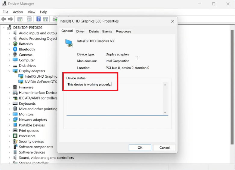 Check Device Status: Right-click the GPU driver and select “Properties.” In the Properties window, you’ll see the “Device status.”
