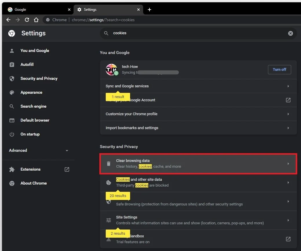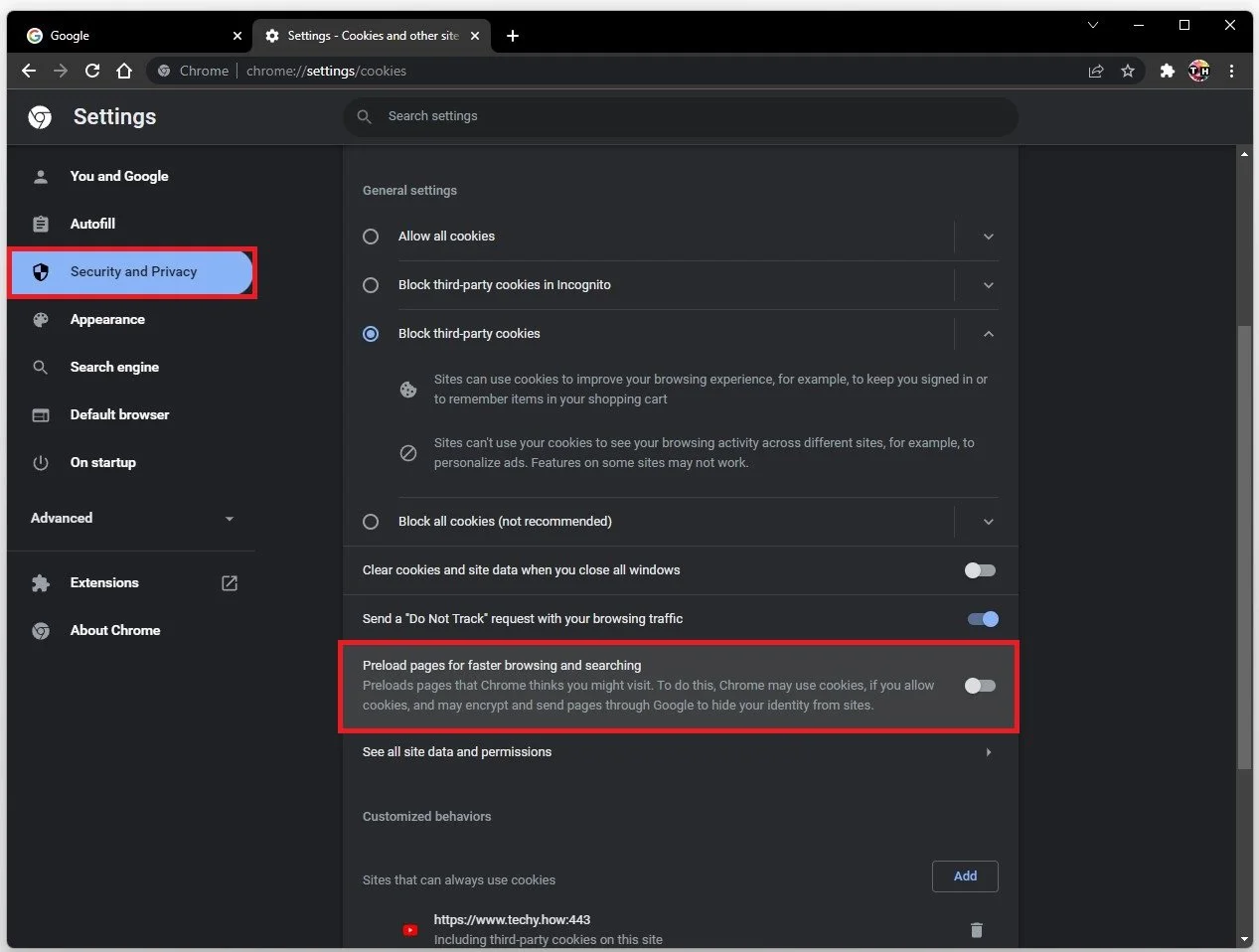 Click on Cookies and other site data in your Privacy and Security settings section. Make sure to disable the Preload pages for faster browsing and searching setting. This can reduce RAM usage when having a lot of tabs open at the same time.