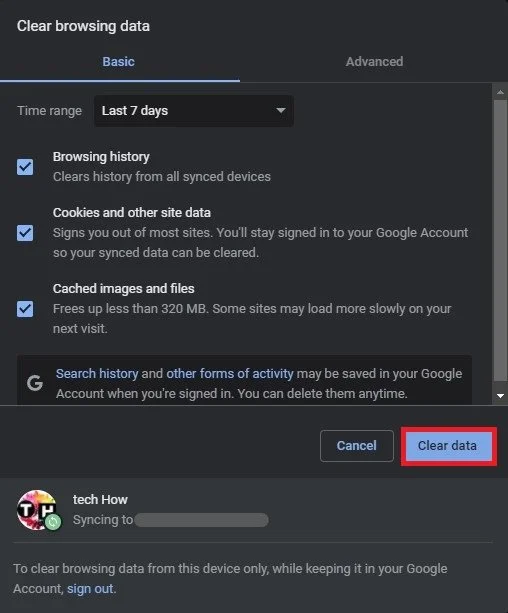 In the Basic section, make sure that the Cookies and other site data and Cache images and files options are selected. Set the Time Range to Last 7 days and click on Clear data.
