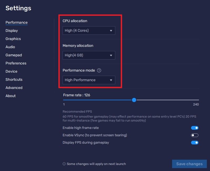 Under Performance Mode, make sure to set this option to High Performance. This might sometimes lower the visual quality to ensure you can keep a better frame rate. I prefer to enable the high FPS option and set the frame rate of the emulator according to my screen refresh rate.