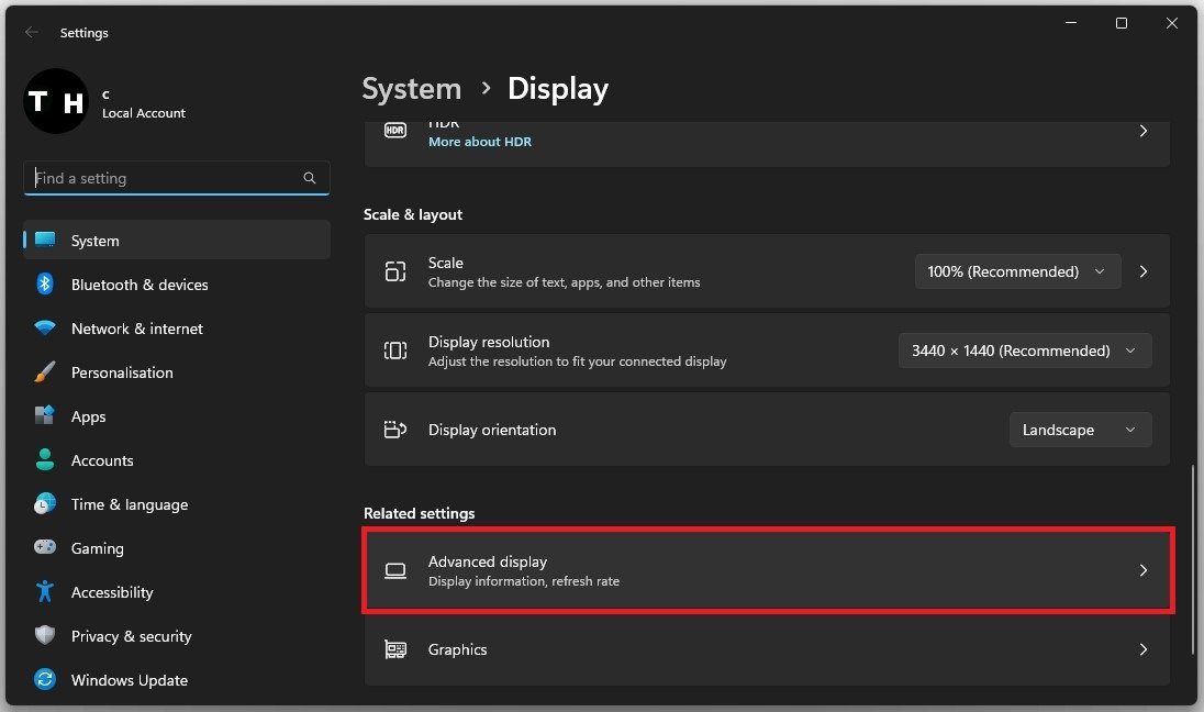 Ensure the correct display is selected, scroll down and click on Advanced Display.