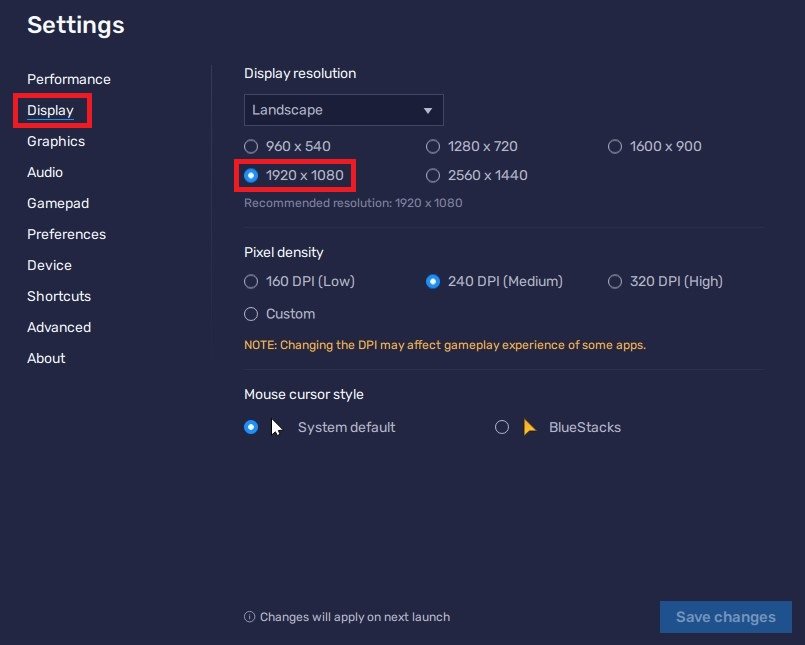 In your Display settings, set the Display Resolution to Landscape. I like to use a resolution of 1920 x 1080, but you can set this to anything you like. You can leave the other settings to their default option and play Clash of Clans to see how well it runs on your PC.