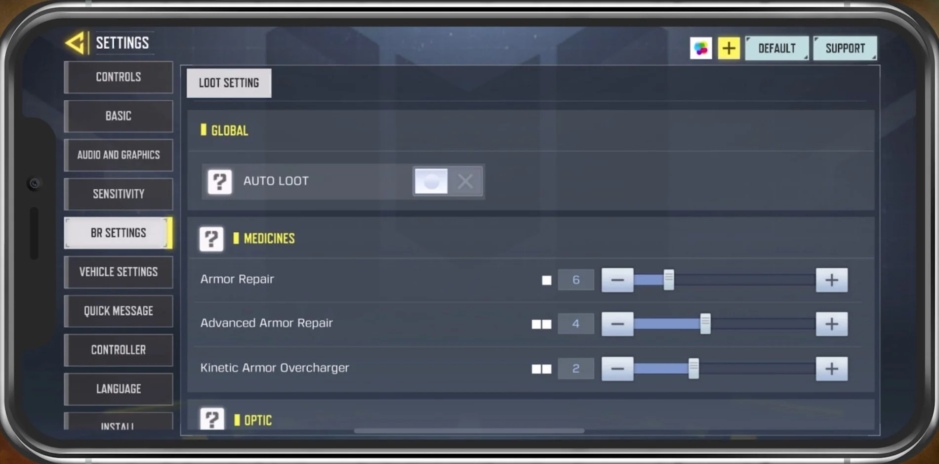 The Battle Royale settings let you change some additional settings for the game mode. Most of these settings should work fine for new players. The Auto Loot option is beneficial to reduce the number of buttons you have to press while in-game. Below, change the amount for each item to be picked up automatically when the Auto Pickup option is enabled.