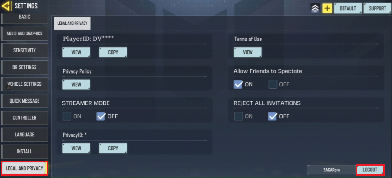 Cod Mobile Settings > Legal and Privacy > Logout