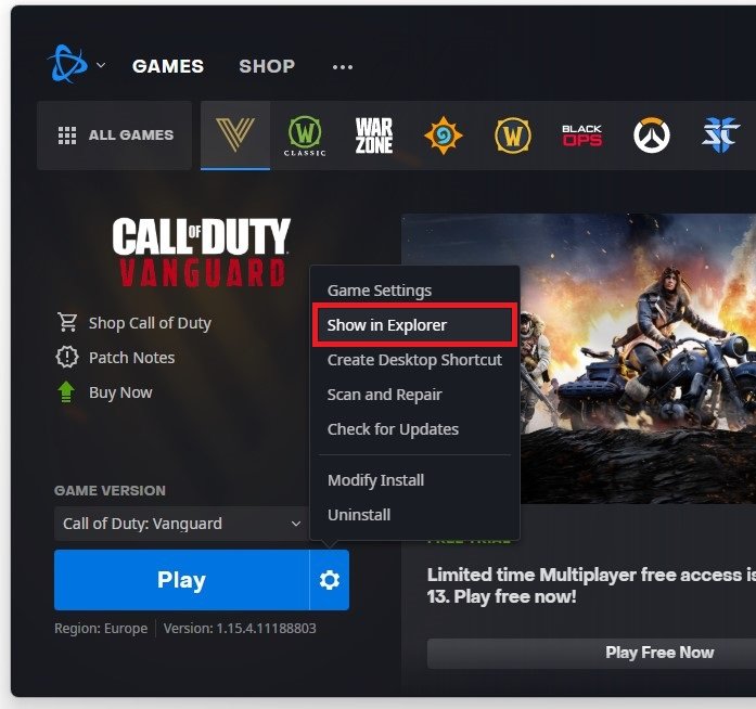 Battle.net > Call of Duty Vanguard > Show in Explorer