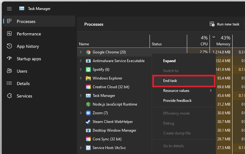 Open up your Task Manager by searching for it in your start menu search. In the Processes tab, make sure to end programs from running that could change your game files or show an overlay while playing the game—for example, CCleaner, GeForce Experience, Adobe applications, Discord, and Chrome.