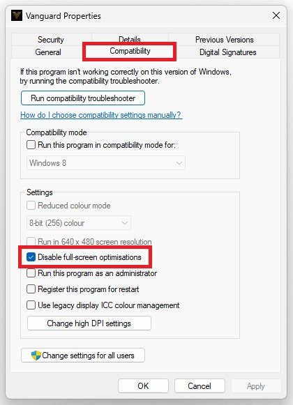 Ensure you’re in the Compatibility tab and select Disable Fullscreen Optimizations and apply your changes.
