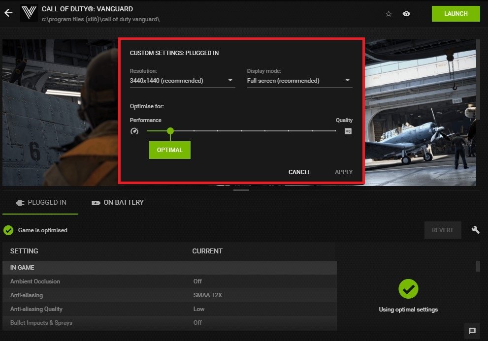 Depending on your hardware, you will be presented with current in-game settings and the optimal settings suggestion. When selecting Optimise, GeForce Experience will apply the recommended settings to the game. Click on the wrench icon to access your custom settings. Here, set the Display Mode to Windowed and apply your changes. You should also use your native monitor resolution in the Resolution setting. You can change your Display Mode back to fullscreen in your in-game settings.