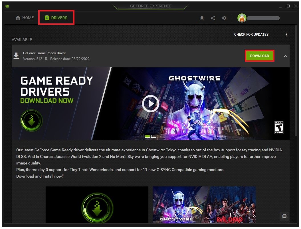 Ensure your graphics card driver is up to date. For NVIDIA GPU users, I recommend using the GeForce Experience application. In the Drivers tab, click Download to automatically download and install the newest driver.