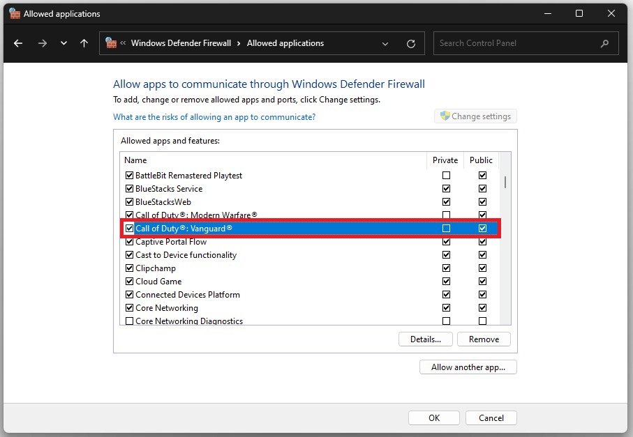 Select Change settings, search for the Call of Duty: Vanguard application, and uncheck it. This will allow you to exclude the application from being blocked by your firewall and will, for some users, prevent the issue.
