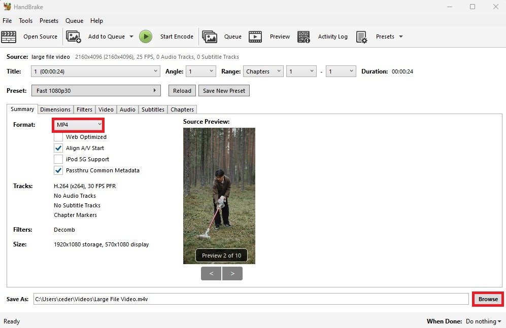 After launching Handbrake on your PC, drag and drop the video you wish to reduce in file size into the Handbrake window. Depending on the file size, this might take a moment, and you can preview your view from here.