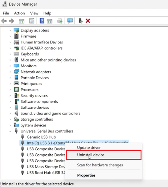 Right-click on the controller driver and select "Uninstall".