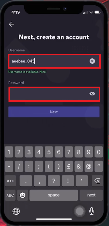 Username Selection: After entering your contact information, tap 'Next' to pick your username.