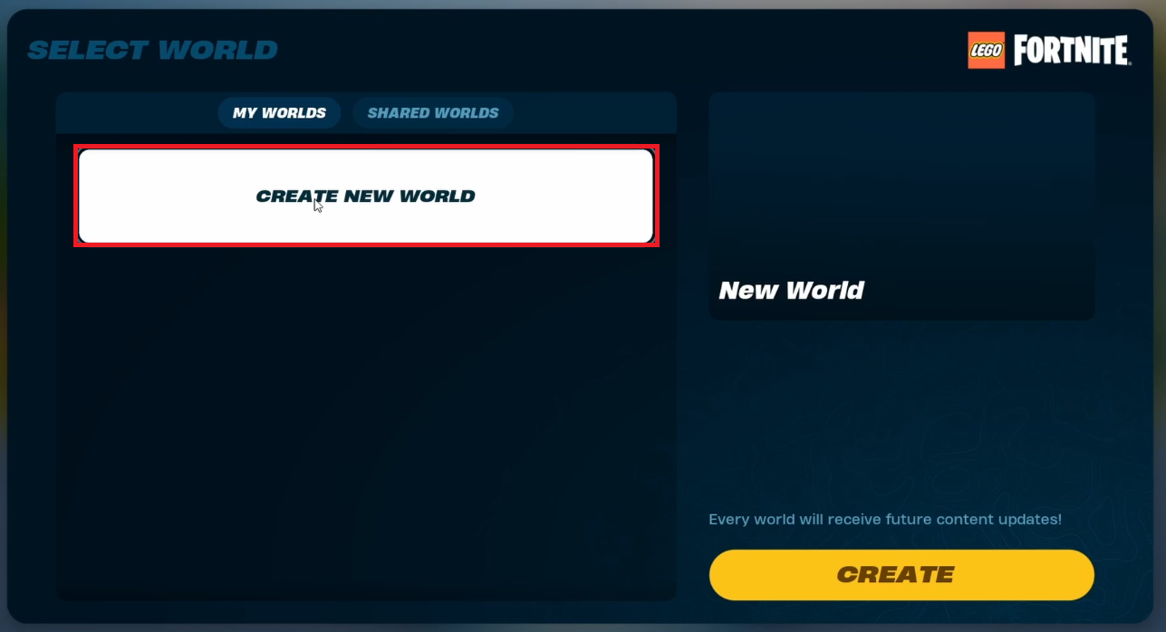Navigate to World Selection: In the Lego Fortnite main menu, find the "Select World" option.