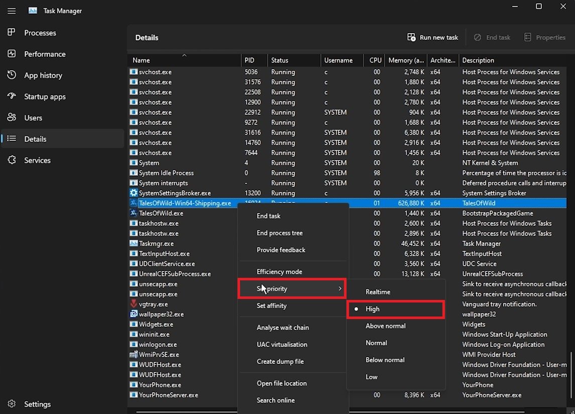 In the Details tab, the TalesOfWild process should be highlighted. Simply right-click the process to set its priority to high. This will help run the game on your system, especially if other applications are running in the background.