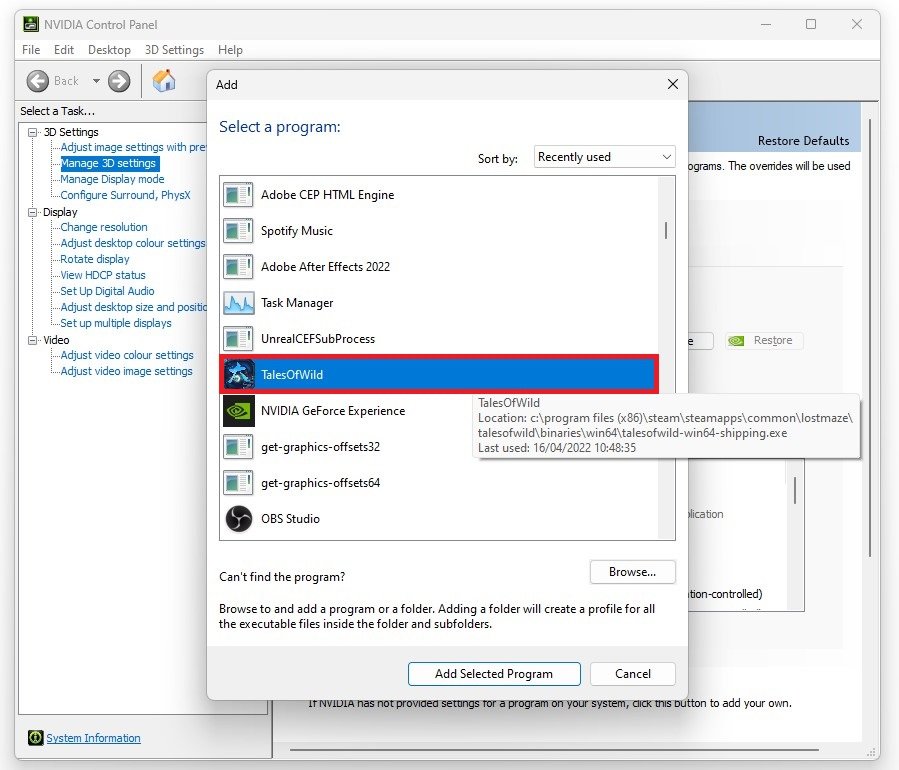 Under Manage 3D Settings, click on Program Settings. Make sure to select Cultivation Tales in this list of recently used applications. If you cannot find the app, click on Add.