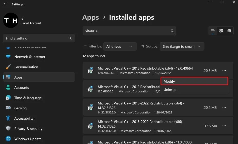 In case the problem persists, then head back to your Windows settings. In the Apps section, select Installed apps. Search for Microsoft Visual C++. A list of Visual C++ Redistributable programs will show up. Click on the burger menu for each and select Modify.