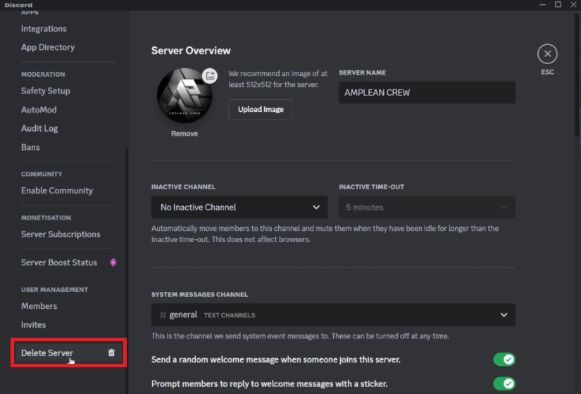 Scroll to Delete: Head to the bottom of the settings page where you’ll find the ‘Delete Server’ option.
