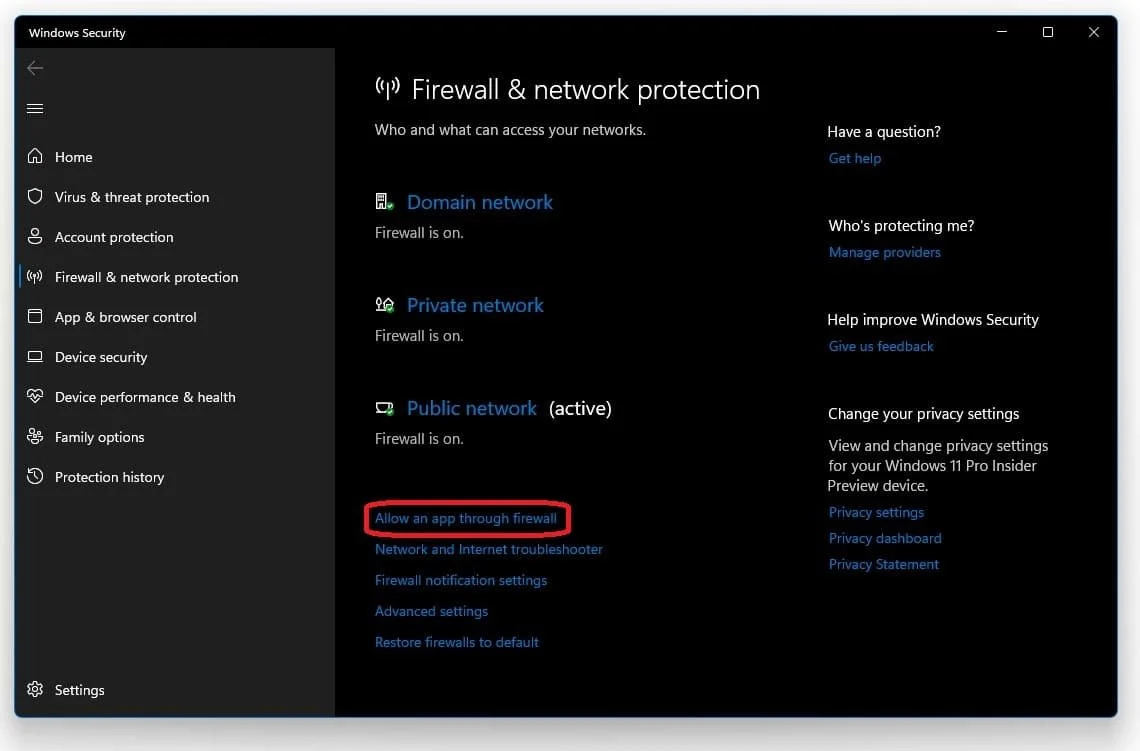 Ensure your firewall is not blocking parts of the software. Search for Firewall in your taskbar search to open up your Firewall & Network Protection system settings window. On the window, select Allow an app through the firewall.