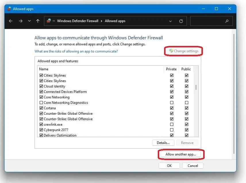 Select Change settings > Allow another app. Select Browse, and your File Explorer will open up. Navigate to the drive on which you saved Destiny 2: Program files > Steam > steamapps > common > Destiny 2, select the Destiny2.exe application and select Open. This will allow you to exclude the application from being blocked by your firewall and will, for some users, prevent the issue.