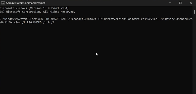 reg ADD "HKLM\SOFTWARE\Microsoft\Windows NT\CurrentVersion\PasswordLess\Device" /v DevicePasswordLessBuildVersion /t REG_DWORD /d 0 /f