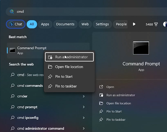 Open the Start Menu and search for "CMD." Right-click on the Command Prompt and select 'Run as administrator' to initiate the command prompt with administrative privileges. Input the following command: