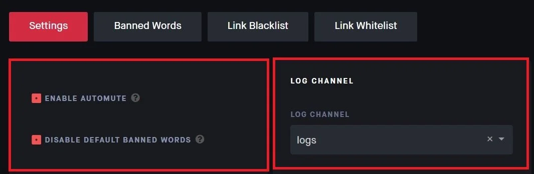 The Enable Automute option will allow Dyno to auto-mute members when they trigger the moderation tool. You can Disable the Default Banned words list by unchecking the checkbox or edit the existing list of banned words later on and keep it enabled for now. The Log Channel option lets you set a channel for Dyno Bot to send auto-mod events, which are usually the username and reason why a user triggered the event.
