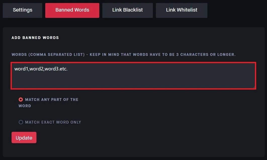 After going through these settings, navigate to the Banned Words tab. Write out a list of words that you want to add to the default banned words list.
