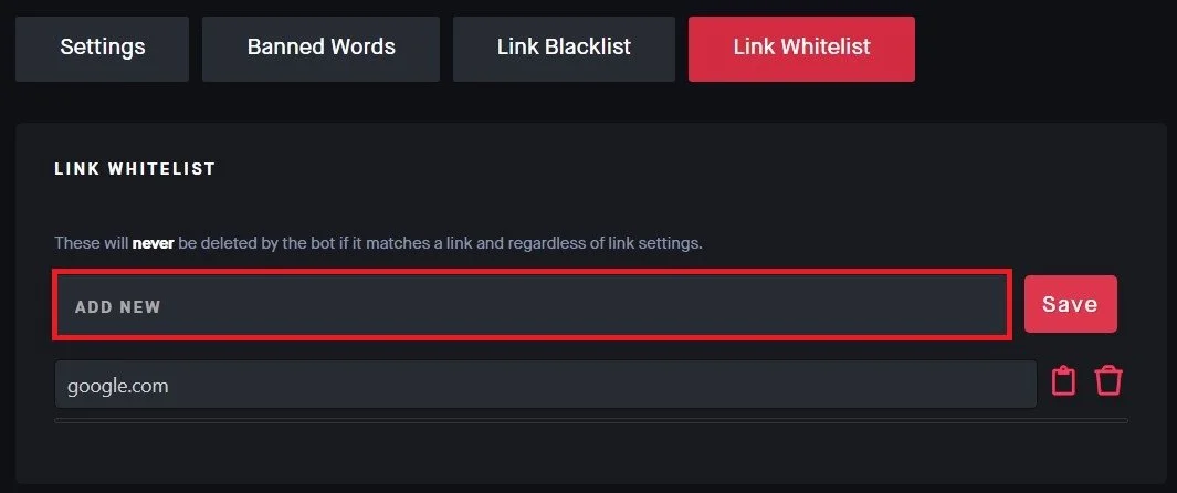 The Link Whilelist is a list of links that will always be allowed to be shown on your Discord server. After saving your changes, the bot will automatically moderate your Discord server.