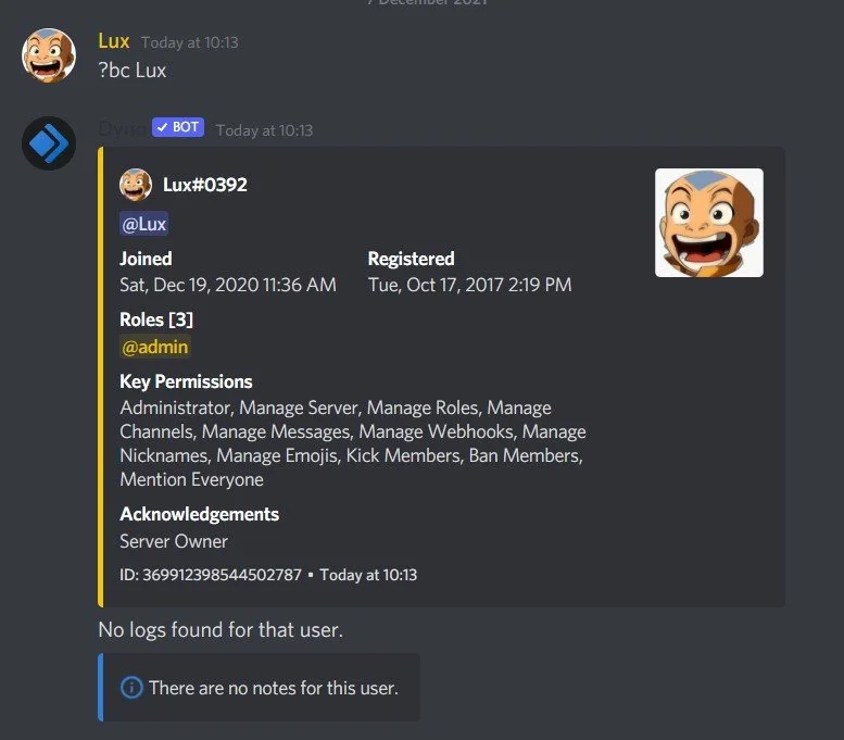 While on your Discord server, use the command on your own username and you will see that the command will display the username, icon, join date, roles, permissions, logs, and notes.
