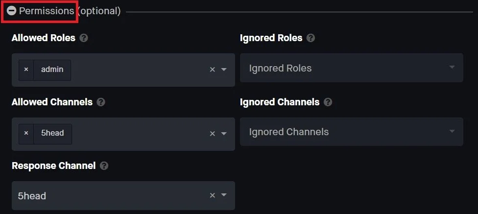 Under Permissions, set the Allowed and Ignored Roles for the bot, which means which roles will be allowed to run a background check, and which roles are not allowed to. The same goes for text channels below. The Response Channel is a selected text channel, where Dyno will display the background check information. This should not be a too public channel.