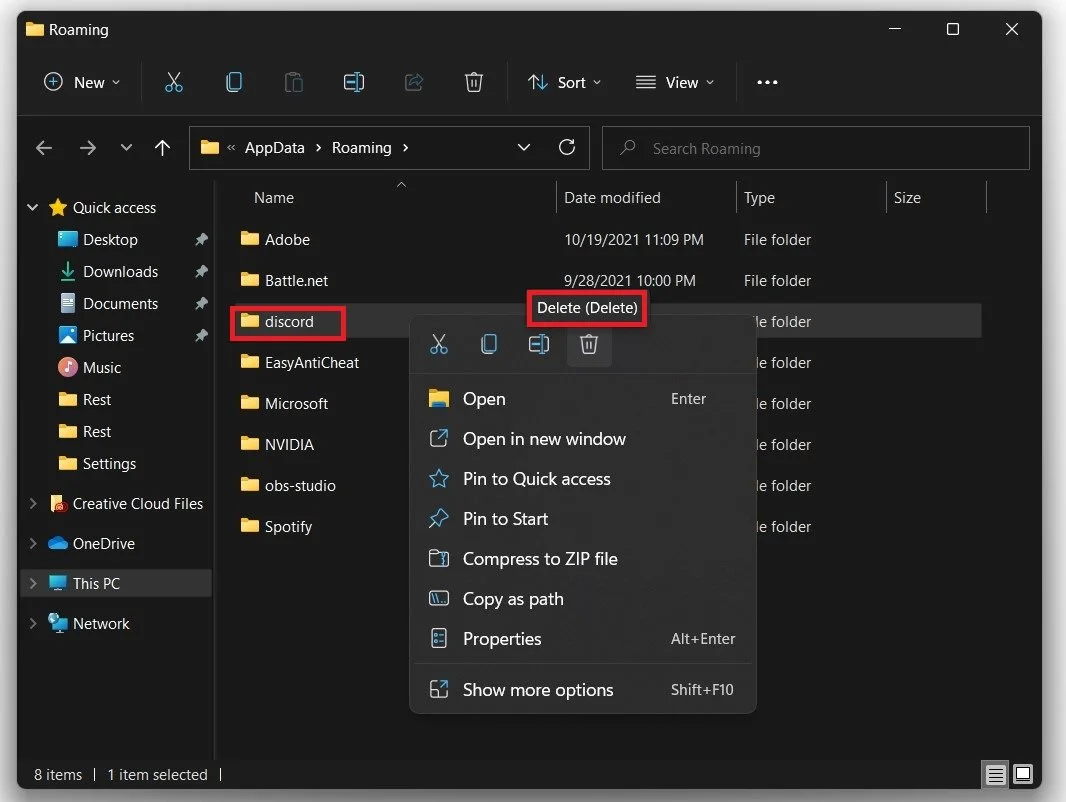 Next, proceed to clear the Discord cache. To do so, close Discord entirely and use the shortcut Windows key + R to open your Run dialogue. In the Run dialogue box, type %appdata% and hit Enter. A file explorer window will open up. Locate and delete the Discord folder. This will clear all the Discord cache and help resolve the black screen share issue.