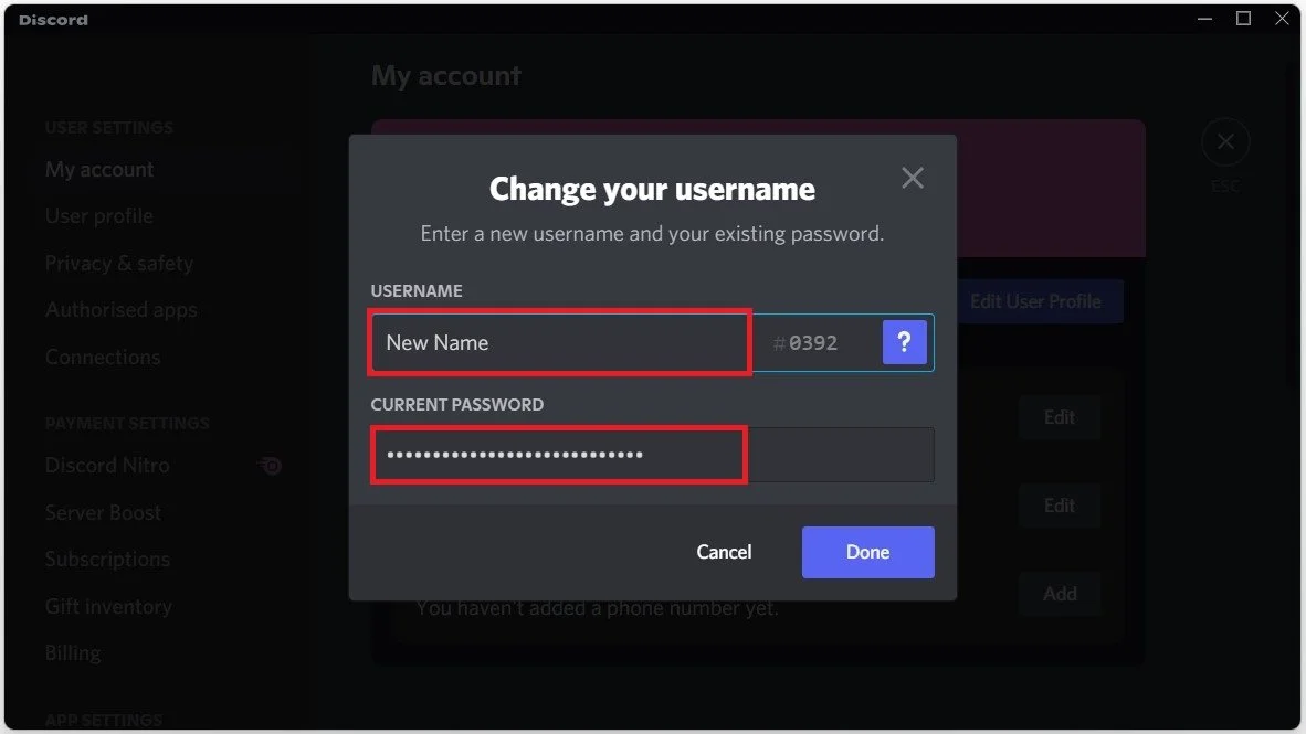 In the dialogue box, enter your new username. If you wish to change your name tag, you will need to subscribe to a Discord Nitro subscription. Below, enter your current account password to apply your changes.