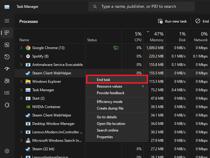 In the "Processes" tab, terminate all resource-intensive processes that aren't required for your Discord stream. This might include applications like Steam, Adobe programs, or your web browser, especially if you're running services like Twitch.