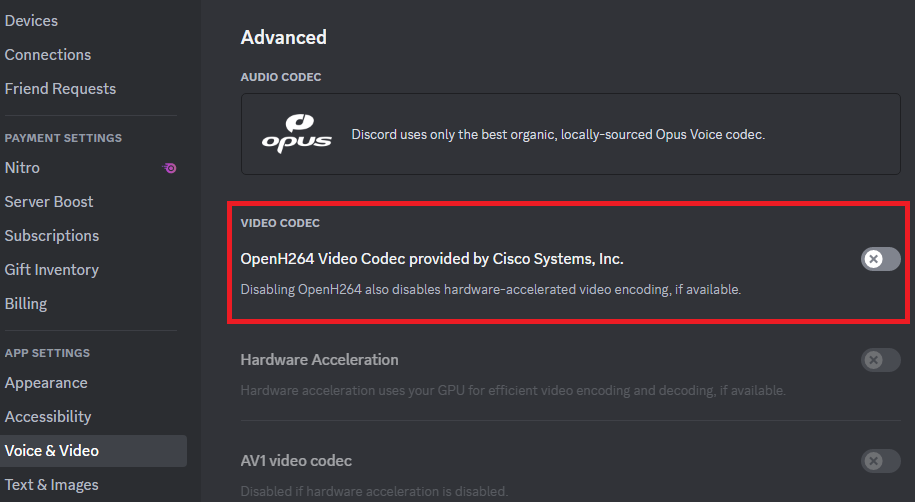 Under the "Voice and Video" tab, navigate towards the advanced settings. Here, uncheck the "OpenH264 Video Codec" option, effectively disabling hardware acceleration. This forces your CPU, instead of your graphics processor, to take up the load of streaming on Discord.