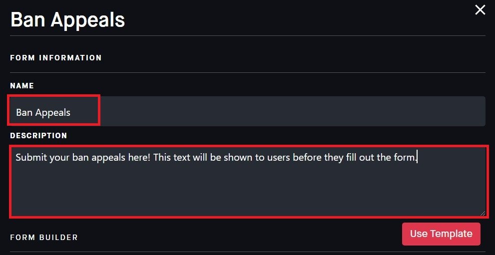 We will choose the ban appeals form, for users who might got banned for no reason. The Form Builder lets you edit the existing questions. You can also select if the answer is required or not.