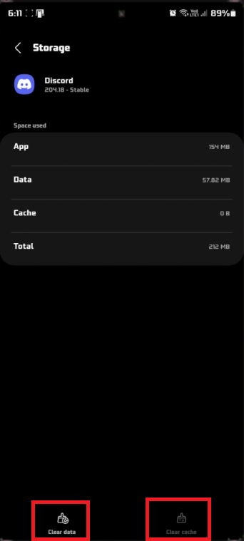 Android Settings > Applications > Discord > Storage > Clear Cache