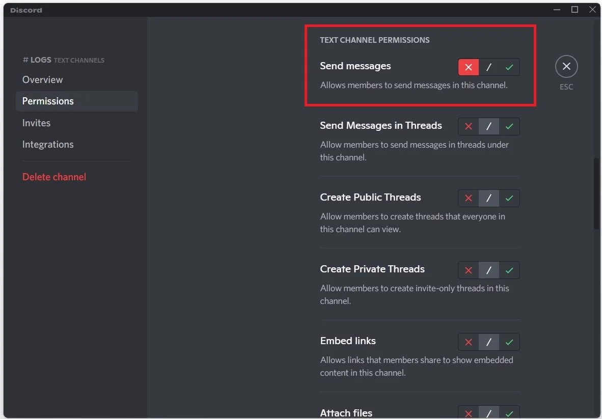 Ensure that the @everyone role is selected, and the Send messages under Text Channel Permissions are disabled. Don’t forget to save your changes. When leaving these Settings as is, no one can write any content in the text channel unless the user is a server admin.