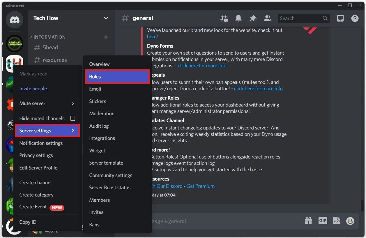 Open up the Discord application and navigate to the Discord server on which you have administrator permissions. Navigate to your server settings by right-clicking your server icon and navigate to the Roles tab.