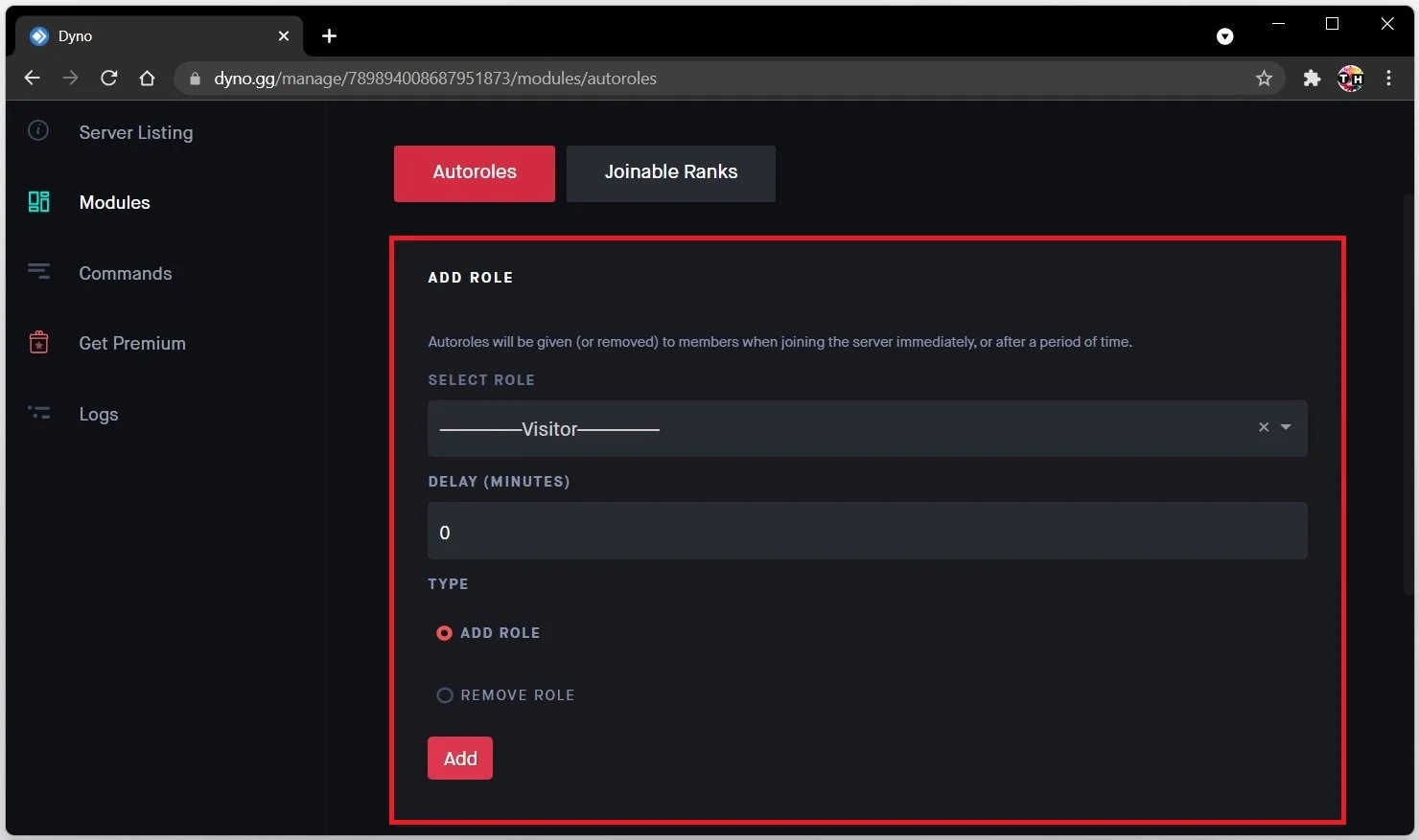 Go back to the Dyno bot website after authorizing it on your account. Select Manage Servers, and you will see a list of Discord servers you have joined or own. Select your server. You might need to authorize Dyno again to change your Discord server. In your Dashboard, under Modules, enable the Autoroles module.