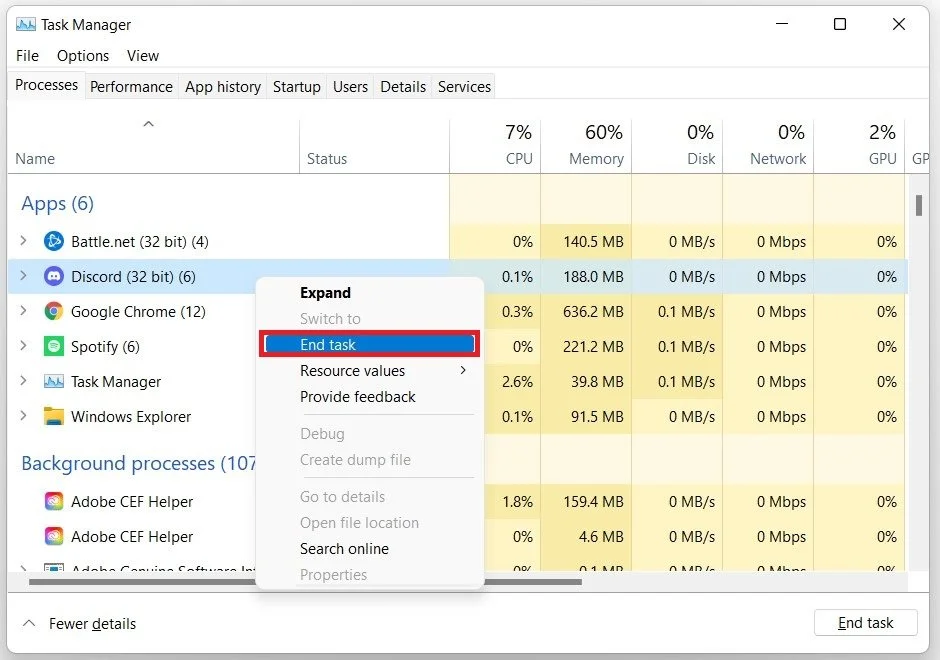Ensure that Discord is not running on your system. Close Discord and open your Task Manager. In the Processes tab, end all Discord processes still running in the background.