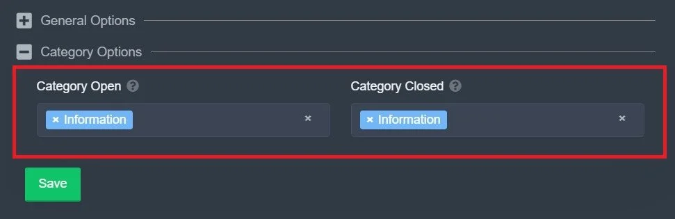In your Category Options, set the Category Open and Closed dialogue boxes to the type of channel your support channel is in, in this case that would be Information.