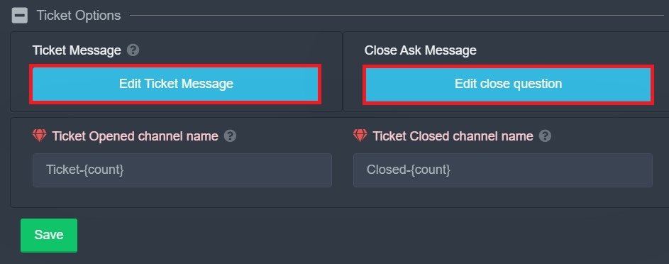 In the Ticket Message tab, you can edit the automatic ticket messages when a user interacts with the Ticket Tool to create a new support ticket. Select Edit Ticket Message. Write some text along the lines of: