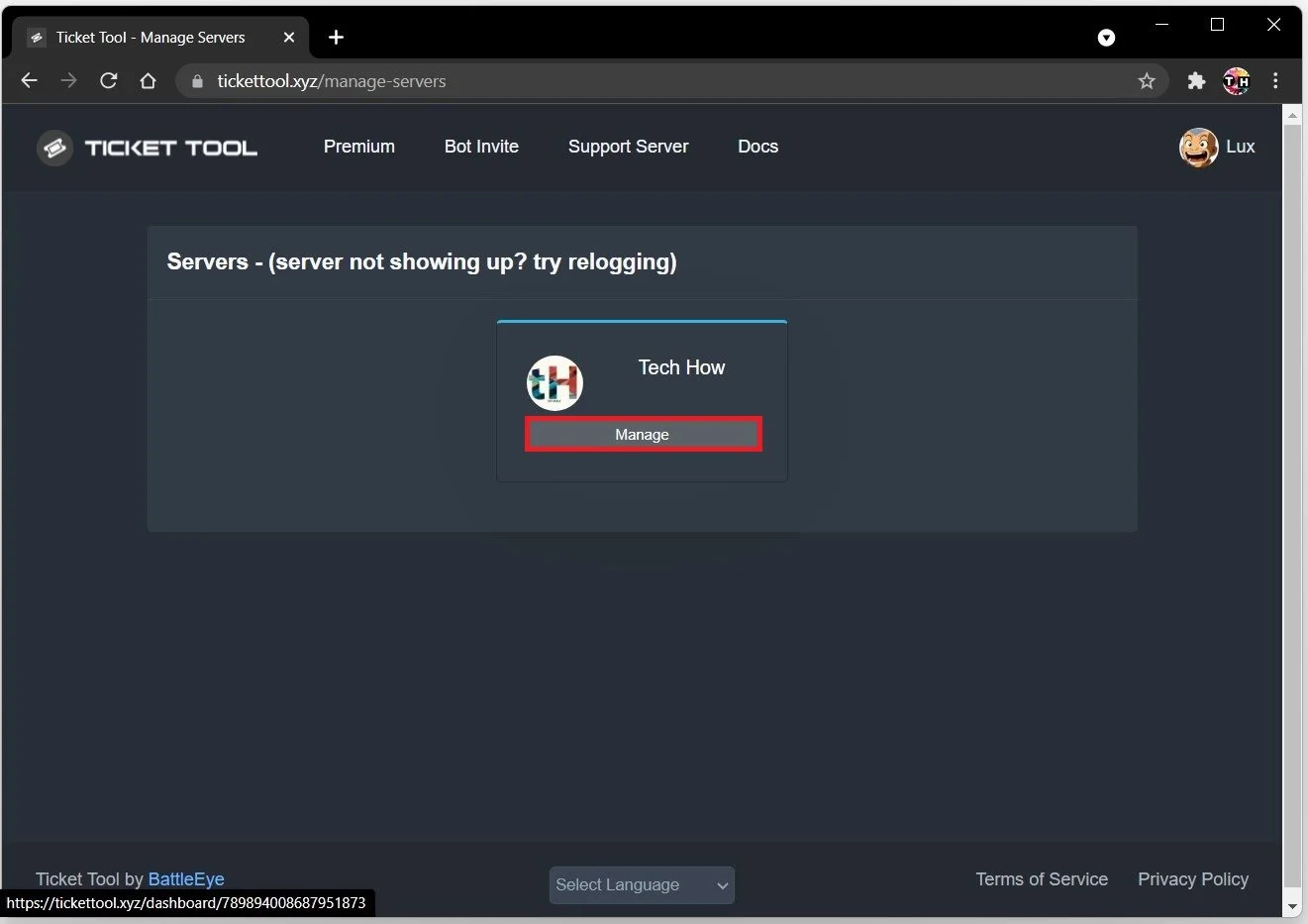 After inviting the bot, go back to the Ticket Tool website and select the Manager Servers button, in order to access your Ticket Tool dashboard.