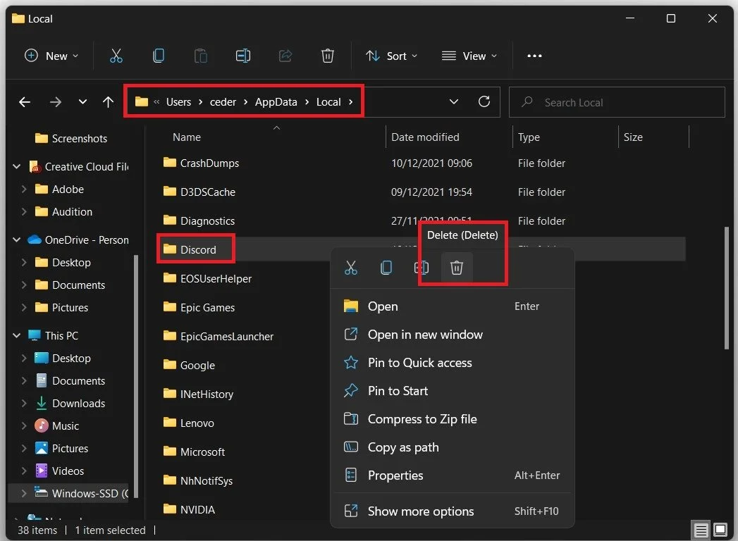 Navigate back to AppData > Local. You will find another Discord folder which you will have to delete.
