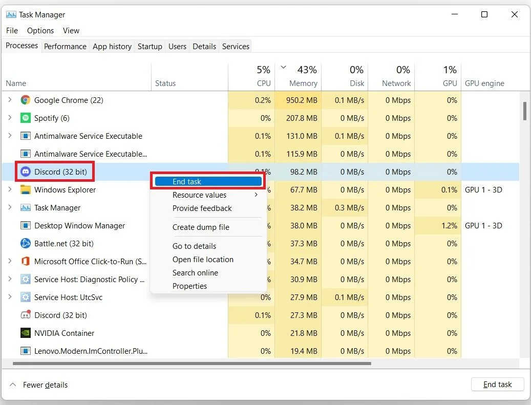 Open up your Task Manager by searching for it in your start menu search. On the window, in the Processes tab, make sure to end all Discord processes from running. This could be the installer or the actual application.