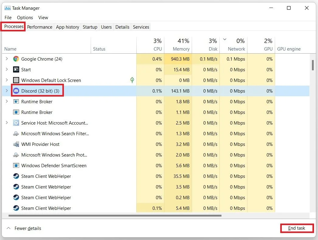 Before tweaking your operating system, we suggest resetting your Discord session. To do so, exit the application by using your Task Manager. Search for Task Manager in your start menu search to open it up. In the Processes tab, locate the Discord processes and prevent them from running.