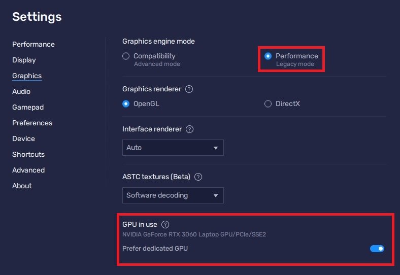 In the Graphics section, set the Graphics engine mode to Performance Legacy mode. Below, make sure to enable the GPU in use option in order to allow BlueStacks to use your graphics processor to help edit videos with CapCut.