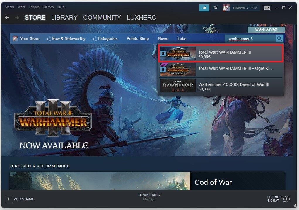 Double-click the Steam shortcut on your desktop to open up the launcher. If it’s your first time using Steam, you must create an account for free, which should only take a minute to complete. Now that this is done search for Warhammer 3 in the Store tab of your Steam launcher.