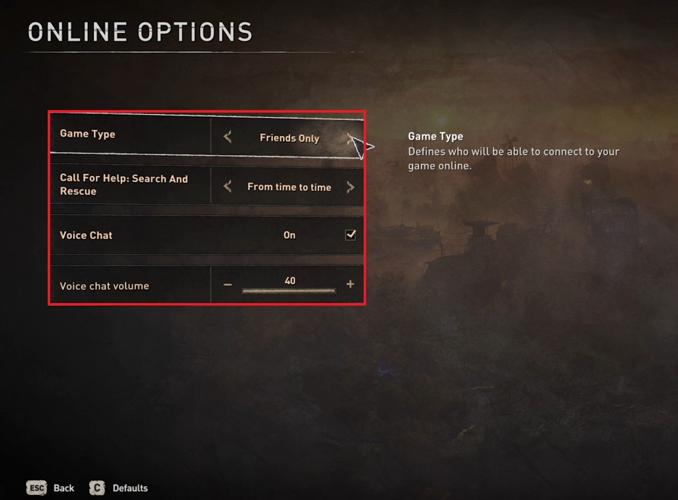 When selecting Online Options, you can change the Game Type from Single Player to Public, Private, or Friends only, and the option will determine who can join your game. Below, you have the Call for Help setting. Set how often the game will look for help in other sessions while you are playing the game. Enable or disable Voice chat and set the voice chat volume below.